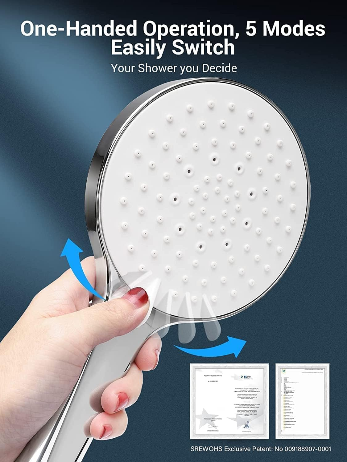 De SREWOHS douchekop is een hogedruk regendouche met waterbesparende technologie en anti-kalkfunctie, ideaal voor dagelijks gebruik. De douchekop heeft 5 verschillende straalopties, waaronder krachtige inbouwstralen voor een optimale douche-ervaring, zelfs bij lage waterdruk.