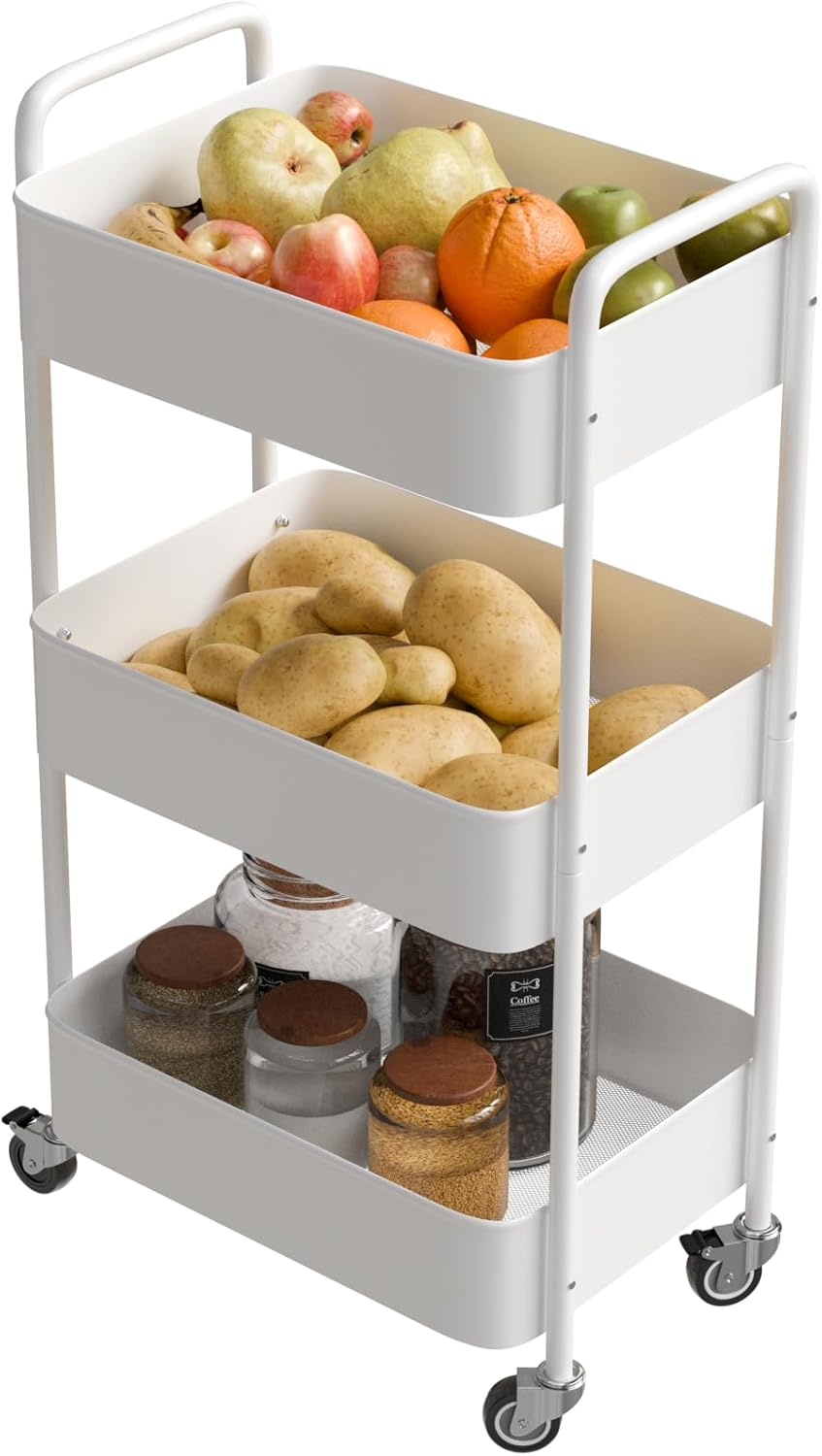 Amig 3-laags Keukenwagen met Wielen – Multifunctionele Trolley Wit, Stalen Rekken