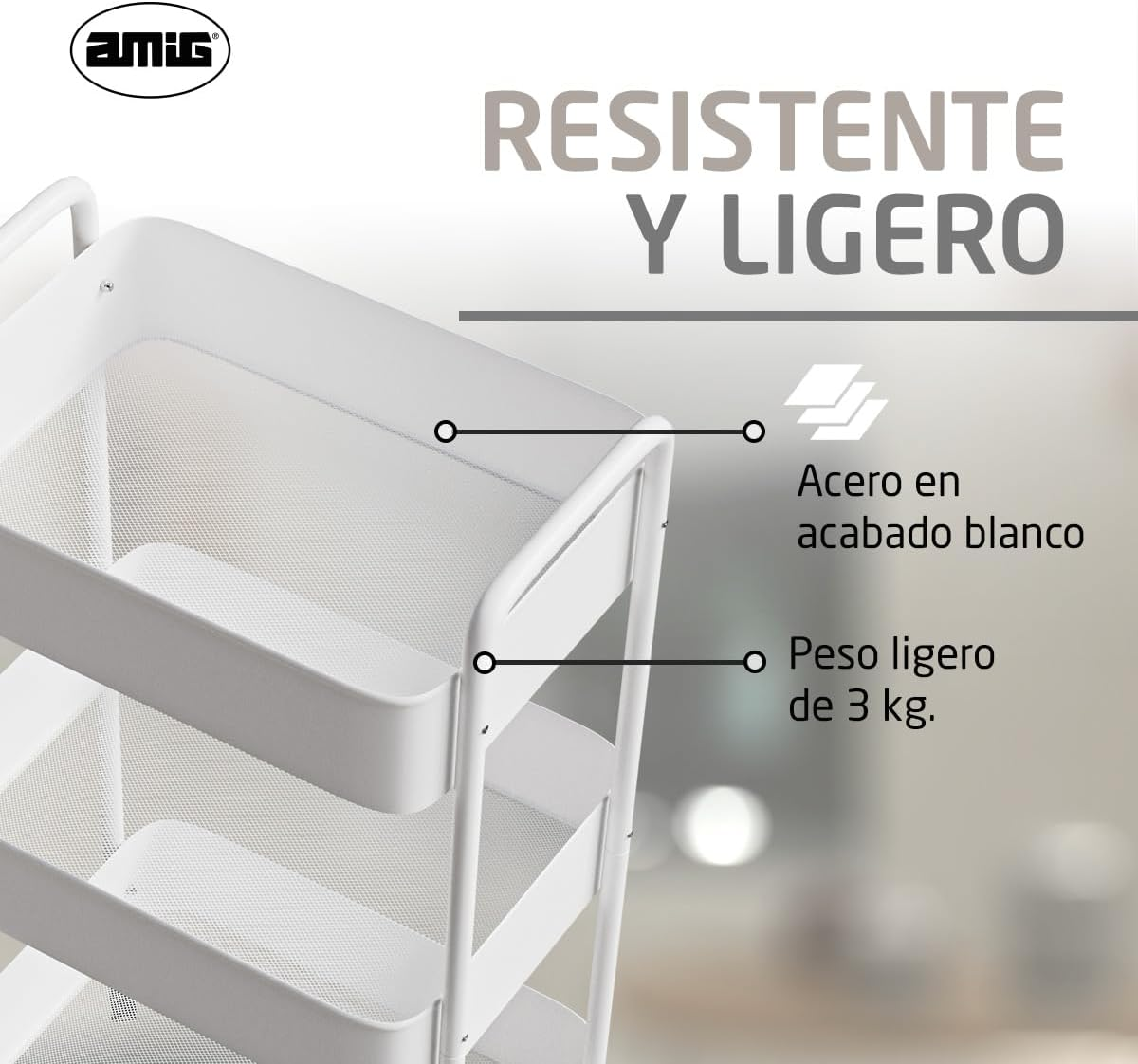 De Amig 3-Tier keukenwagen Mod. LINN is een compacte en multifunctionele trolley die perfect is voor de keuken, badkamer of zelfs kantoor. Met 3 stevige stalen rekken biedt deze trolley voldoende ruimte voor groenten, fruit of andere benodigdheden. Dankzij de wieltjes verplaats je de trolley eenvoudig, waardoor hij flexibel inzetbaar is in elke ruimte.