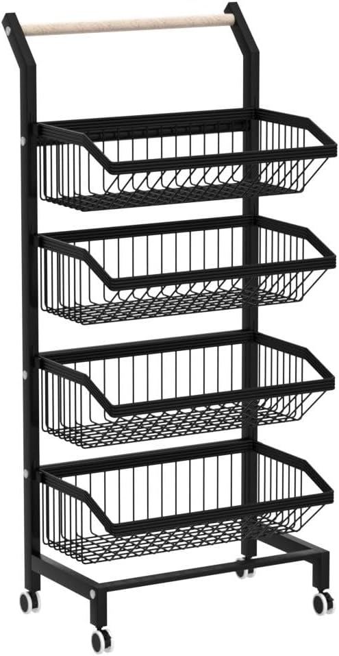 COVAODQ Stapelbare Groentewagen met Wielen – Zwart, Houten Handvat