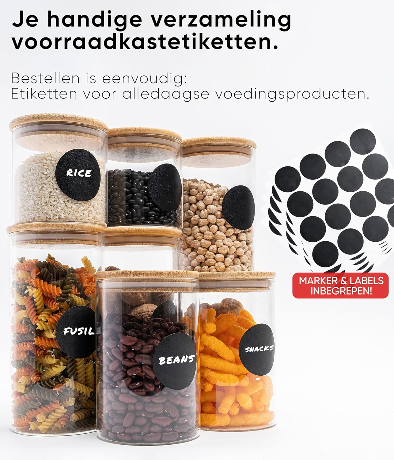 Inclusief etiketten, trechter en reinigingsborstel – makkelijk vullen en organiseren.