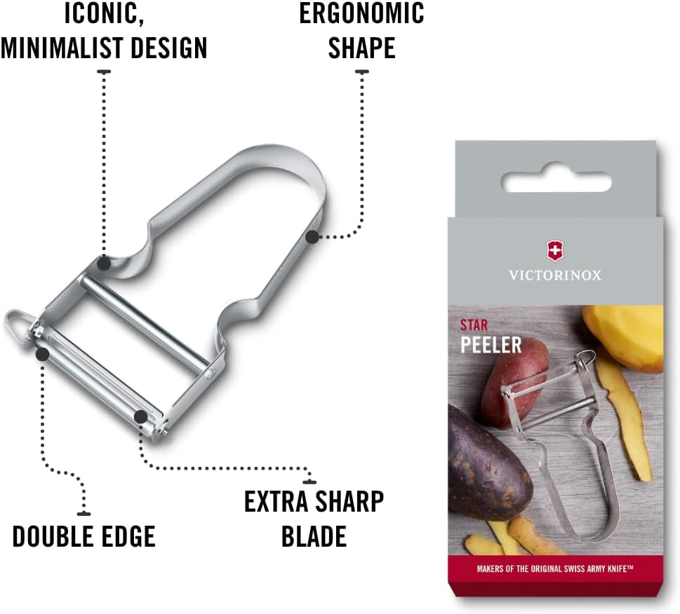 De Victorinox STAR Sparschäler is een hoogwaardige en duurzame peeler, ideaal voor het moeiteloos schillen van fruit en groenten zoals appels, peren, wortels en aardappelen. Het Inox-handgreep biedt stevigheid en comfort, terwijl het grijze design een moderne uitstraling geeft.