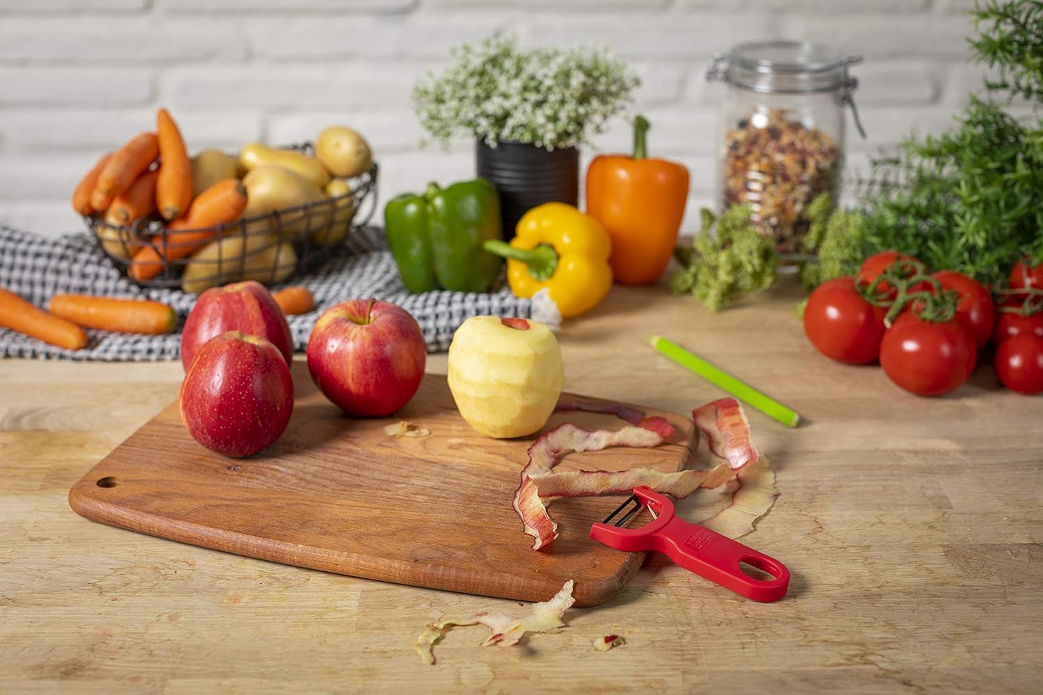 De KUHN RIKON 22060 Swiss Peeler is een hoogwaardige en ergonomische dunschiller, ideaal voor het efficiënt en veilig schillen van fruit en groenten zoals appels, peren, wortels en aardappelen. Het rode handvat zorgt voor een comfortabele grip en een opvallend, modern design in de keuken.