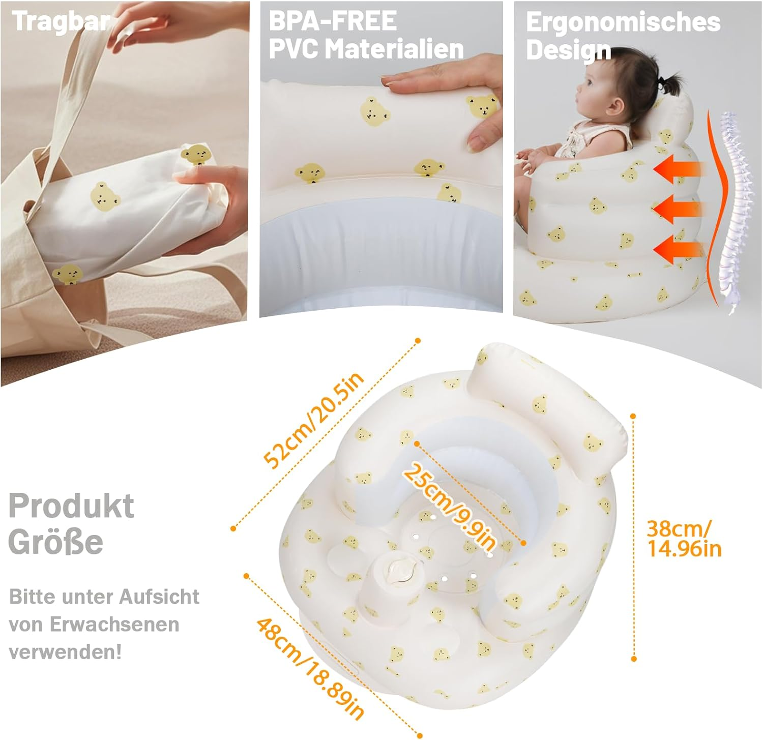 Dankzij het opblaasbare ontwerp is het makkelijk mee te nemen en op te bergen. Dit babyzitje is perfect voor ouders die hun baby veilig willen laten zitten tijdens waterpret of spel, terwijl comfort en plezier centraal staan.