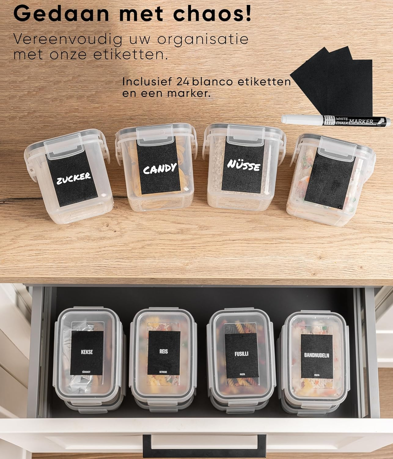 Deze set met 16 voorraaddozen is bedoeld voor het overzichtelijk en luchtdicht bewaren van droge producten zoals pasta, rijst, meel en granen. De transparante bakken maken de inhoud direct zichtbaar, wat helpt bij sneller koken en voorraadbeheer.