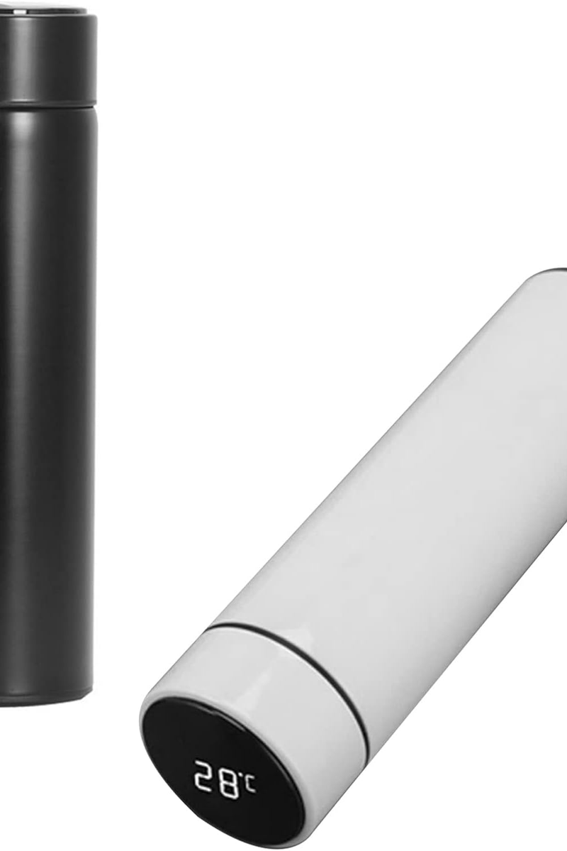 Roestvrijstalen fles met temperatuurweergave. Dubbelwandig, vacuüm geïsoleerd en lekvrij. Ideaal voor reizen of onderweg.